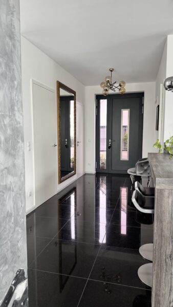Böden: Granitfliesen (60 × 60 cm) im Erdgeschoss, Eiche-Dielenparkett im Obergeschoss